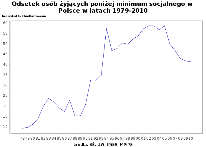 Odsetek osób żyjących poniżej minimum socjalnego w Polsce w latach 1979-2010 - http://chartgizmo.com/GenerateChart?id=37629