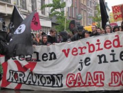Wczesniej ustalono pokojowy charakter manifestacji. Wedlug organizatorow jest jeszcze szansa na odrzucenie restrykcyjnego prawa w parlamecie,zadyma dala by ponoc pretekst do jego wprowadzenie...w czasie marszu rozdawano przechodnia ulotki, orzechy i ciastka. Demo zatrzymalo sie pod jednym ze slotow ktorych w utrechcie jest sporo,mieszkancy dali krotki koncert a nastepnie zamaskowana skloterka odczytala bojowy apel i wezwanie do wzmozonej aktywnosci.aplauz i pelna gotowosc...po drodze demo uroslo do ok 3 tys, caly czas dochodzili nowi uczestnicy.